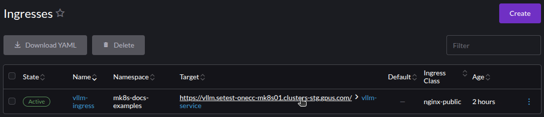 In the Rancher Dashboard, go to Service Discovery > Ingresses to confirm the Ingress was created. Under Target, you'll find the URL to access the vLLM service:
